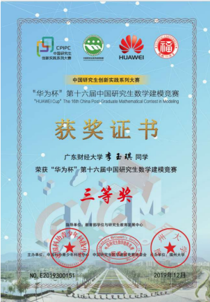 12 | 黄炜玲 等 | “华为杯”第十六届中国研究生数学建模竞赛三等奖 | 2019年 |