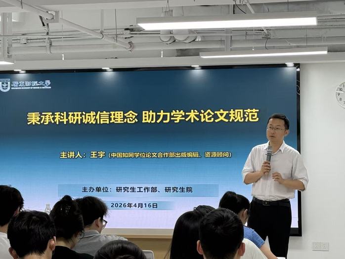 讲座中,王宇系统解读了国内科研诚信相关政策,介绍了当前学术治理的政策导向与规范要求,并结合真实案例深入剖析了学术不端行为的常见类型及其严重后果,警示同学们要时刻保持敬畏之心,远离抄袭、剽窃、数据造假等失范行为。随后,分享了关于AIGC在学术领域中合理使用的思考,强调应正确认识AI工具的辅助边界,既要善用技术提升研究效率,又要坚守学术诚信底线,避免过度依赖或不当使用生成式人工智能。最后多维度讲解了学位论文的写作规范,为研究生们提供了切实可行的写作指导。